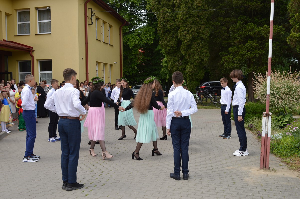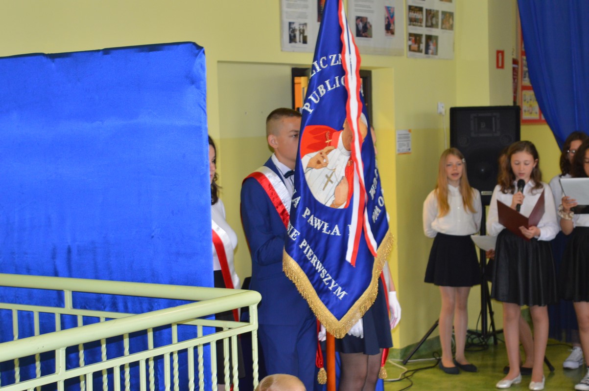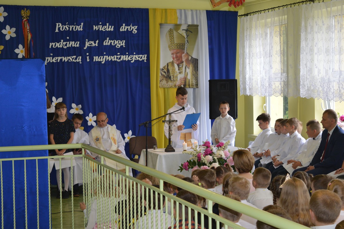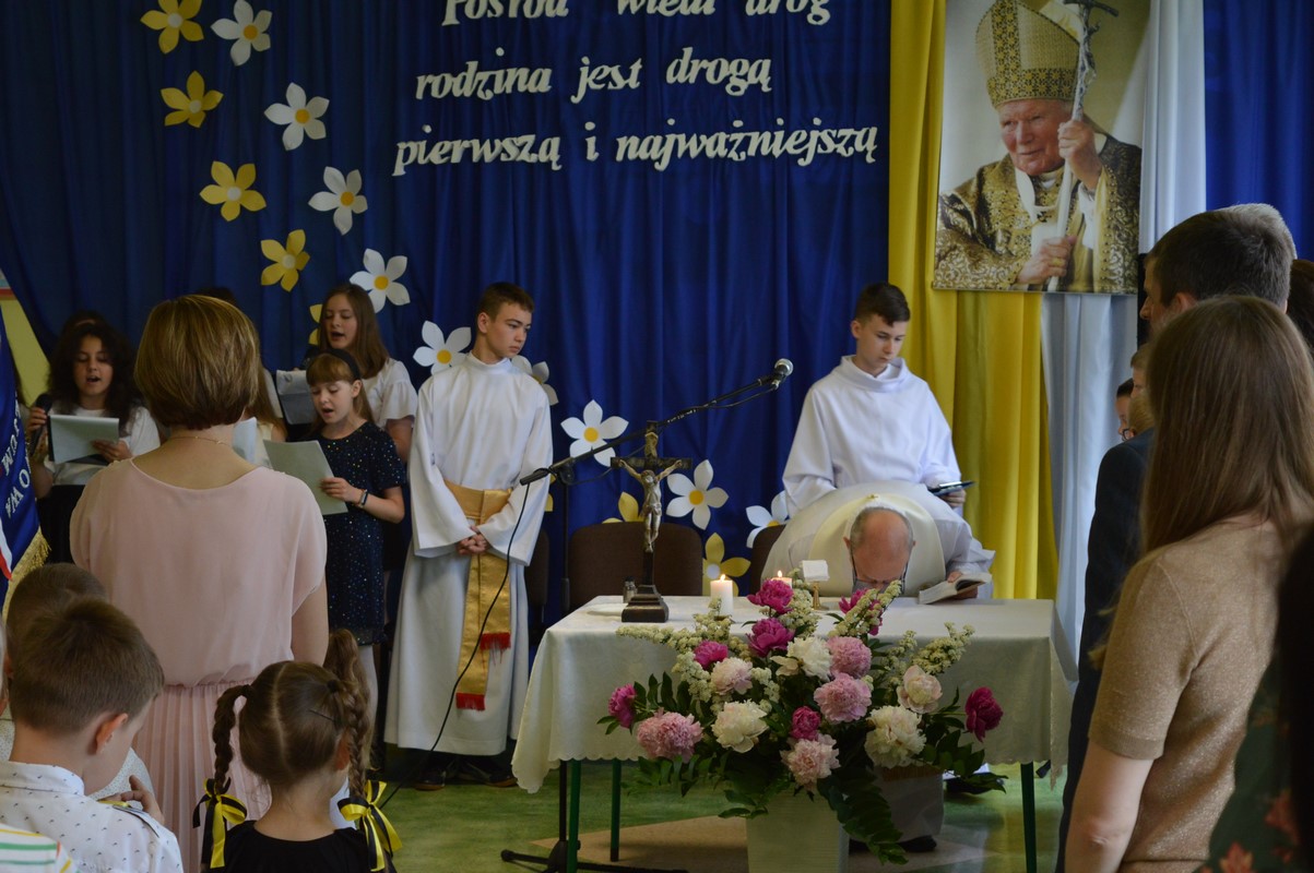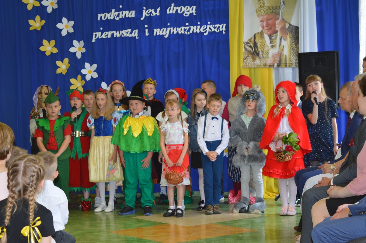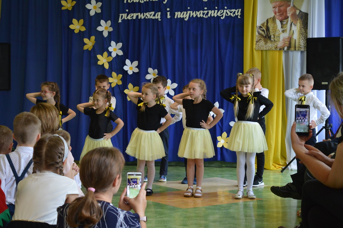 Uroczystą część święta szkoły rozpoczęły występy dzieci z przedszkola, zerówki oraz kl. I – III, które występem, piosenką, tańcem i wierszem podziękowały swoim rodzicom, babciom i dziadkom za miłość, trud i oddanie. Następie miała miejsce uroczysta akademia przygotowana przez uczniów kl. IV – VIII, młodzież przypomniała najważniejsze wydarzenia z życia Papieża Polaka, wplatając w te wspomnienia piękne piosenki i nagrania słów św. Jana Pawła II. Na zakończenie uczniowie najstarszych klas zatańczyli Poloneza.