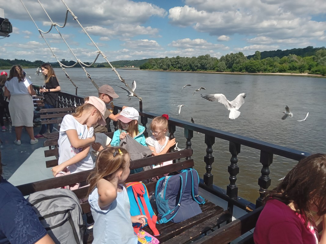 Po tej ogromnej ilości wiadomości na temat Kazimierza Dolnego czekał na nas obiad w pobliskiej restauracji oraz spotkanie z pomnikiem kundelka, którego wszyscy obowiązkowo głaskali po nosie na szczęście. Każdy z uczestników wycieczki miał okazję zakupić sobie pamiątki, wśród których nie mogło zabraknąć kogucika kazimierskiego, symbolu miasteczka. Na koniec odbył się długo wyczekiwany rejs statkiem po ,,królowie polskich rzek”-Wiśle. Mogliśmy się zrelaksować i podziwiać Kazimierz z innego, wiślanego punktu widzenia.