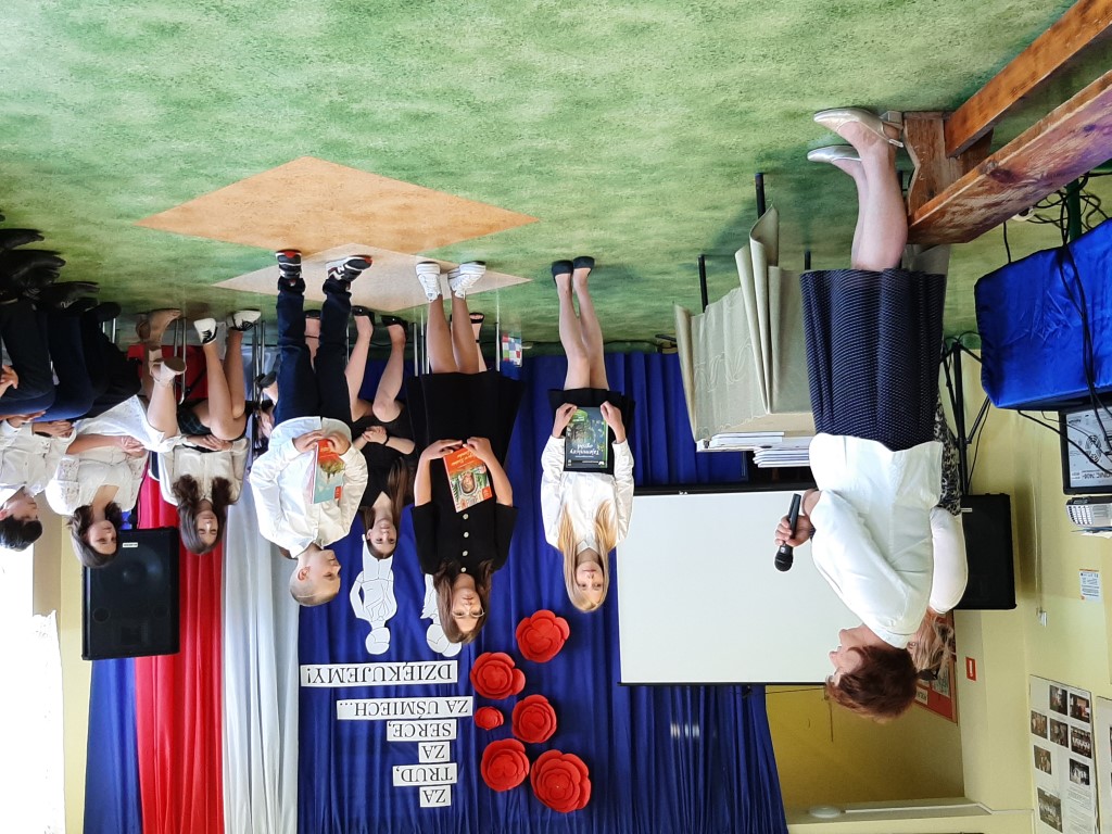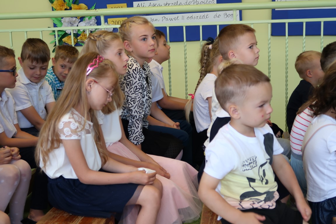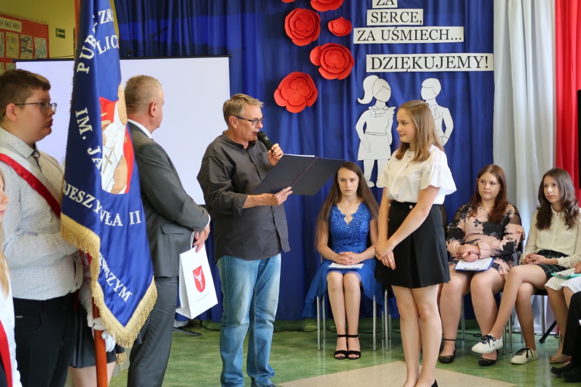 Kolejnym etapem uroczystości było wręczenie przez Panią Dyrektor i Wychowawców klas I –VII świadectw z wyróżnieniem i nagród książkowych za wysokie wyniki w nauce oraz bardzo dobre lub wzorowe zachowanie. Pozostali uczniowie otrzymali świadectwa od wychowawców w swoich klasach. Opiekunowie Samorządu Uczniowskiego, panie - Jolanta Zbiżek i Iwona Lenart, wręczyły nagrody książkowe i inne atrakcyjne upominki uczniom najbardziej zaangażowanym w działalność Samorządu Uczniowskiego, a nauczyciel bibliotekarz p. Ewa Kamińska-Rząd wręczyła dyplomy dla najlepszych czytelników.