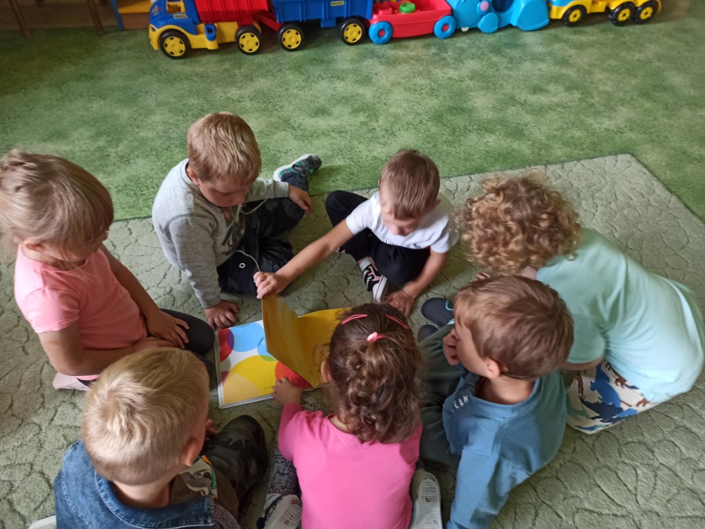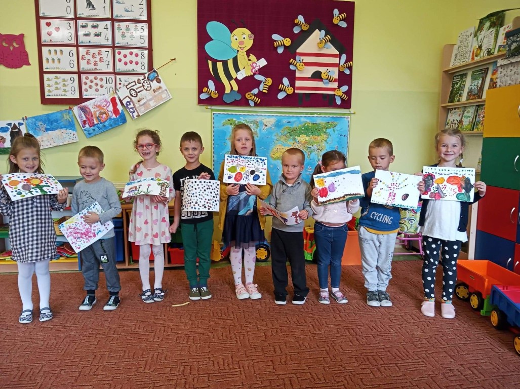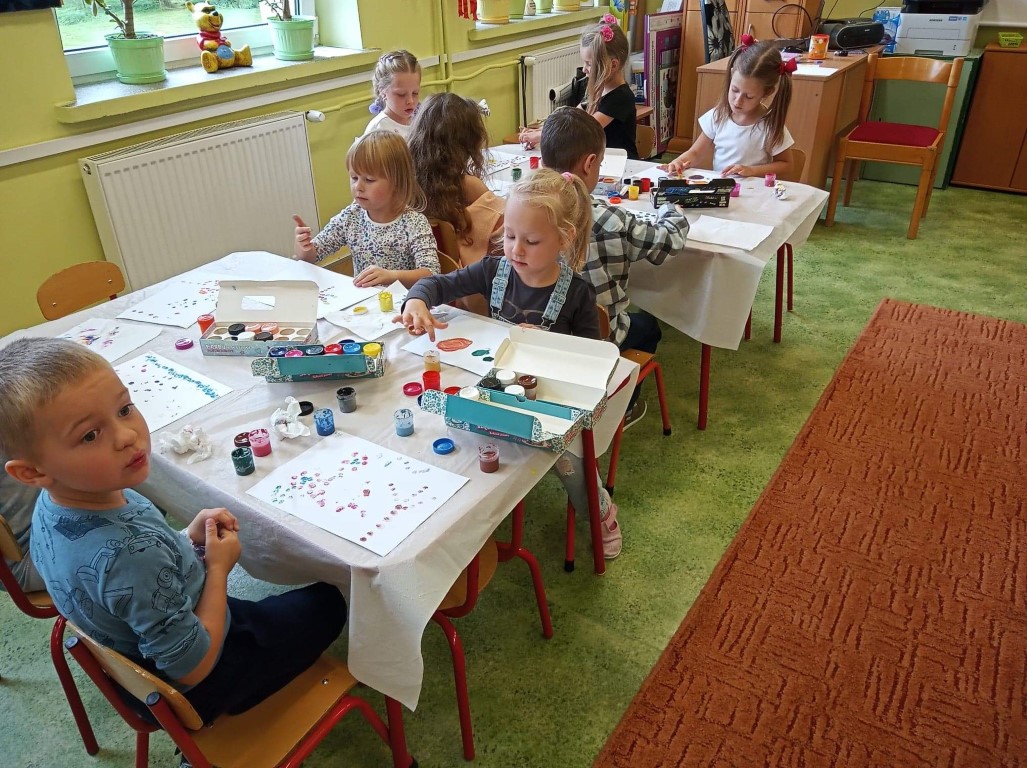 Przedszkolaki z grupy "Skrzatów" i "Pszczółek" w tym dniu mogły wysłuchać czytanej przez Panie książki H. Tullet "Naciśnij mnie" uruchamiając swoją wyobraźnię, a następnie tworzyć własne kreatywne "dzieła sztuki". Dzieci z grupy młodszej zrobiły chorągiewki, przyklejając kolorowe kropki z papieru, natomiast starsza grupa malowała palcami, tworzą za pomocą kropek obrazy według własnego pomysłu. Dzieci z dumą prezentowały powstałe prace. Mogły też wziąć udział w zabawach i rozwiązywać zagadki.
