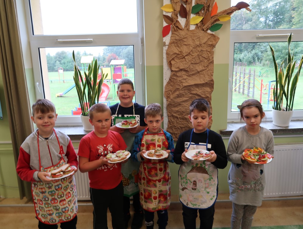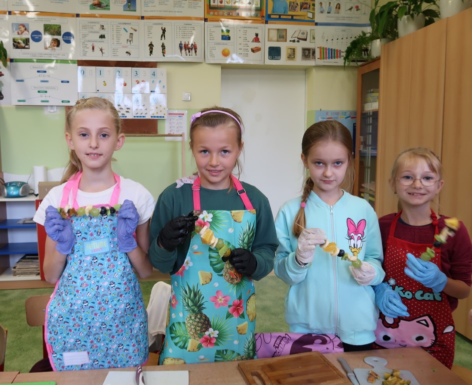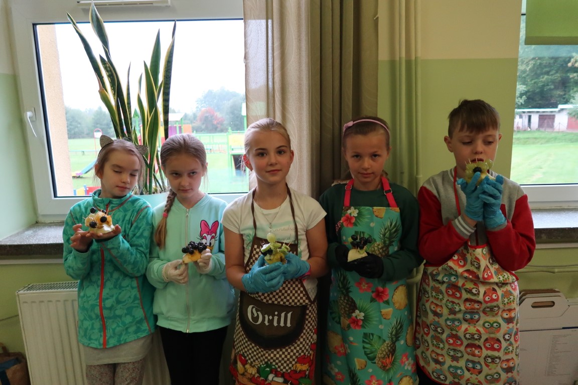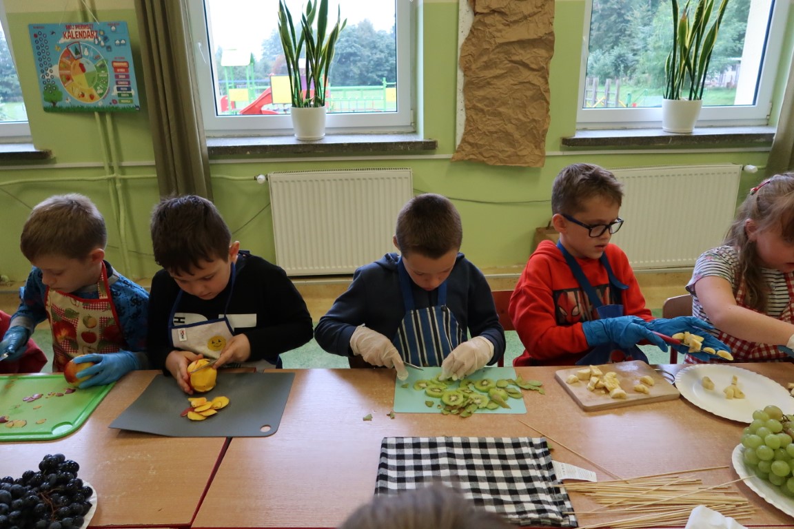 Dzieci tego dnia miały dużo pracy, każdy kroił owoce na kawałki oraz nadziewał na patyczki tworząc pyszne i zdrowe szaszłyki owocowe. Dzieci wykonywały również jeżyki z gruszek i winogron oraz kanapki. Wszyscy pracowali z ogromnym zaangażowaniem i świetnie sobie poradzili. Po skończonej pracy wszystkie dzieci ze smakiem zjadły zdrowe przysmaki. Warsztaty sprawiły uczniom wiele radości i satysfakcji.