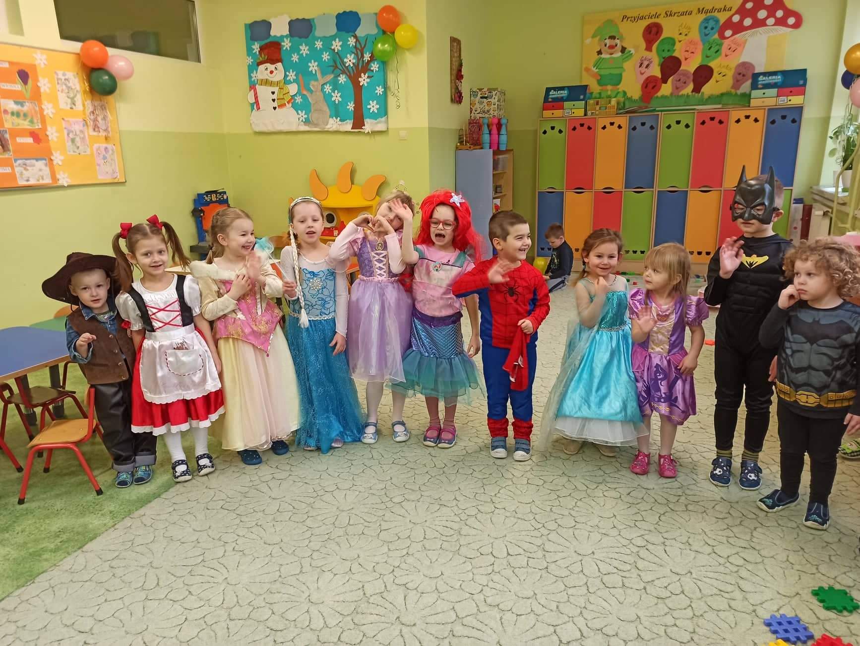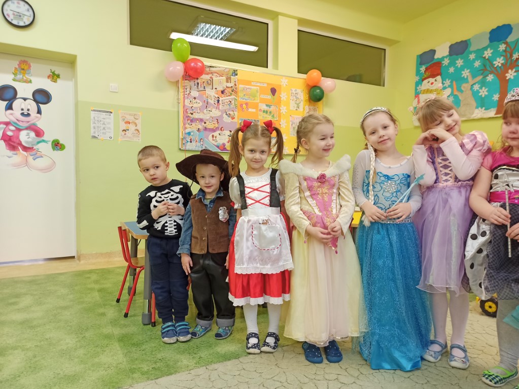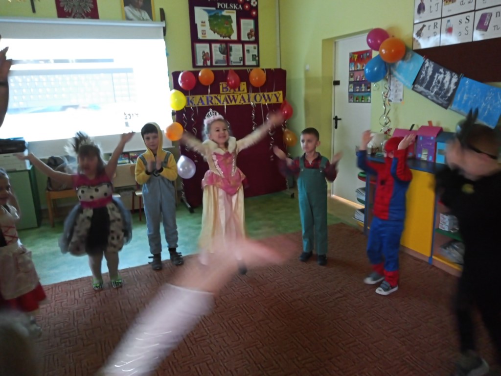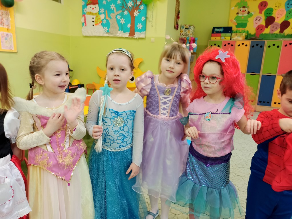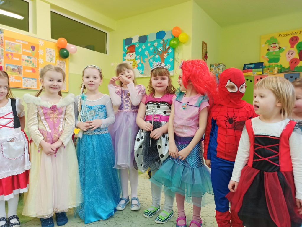 W tym roku zabawa karnawałowa w naszym przedszkolu odbyła się w ostatnim tygodniu przed feriami. Ze względu na panującą pandemię dzieci z grupy "Skrzatów" i "Pszczółek" bawiły się w swoich salach, które pięknie przystroiły w kolorowe balony i serpentyny. Doskonała muzyka i wesoła atmosfera sprzyjały dobrej zabawie. Przedszkolaki ubrane w kolorowe stroje: księżniczek, superbohaterów i innych postaci z ulubionych bajek bawiły się wesoło ze swoimi paniami. Dzieci również chętnie uczestniczyły w przygotowanych zabawach muzyczno - ruchowych.