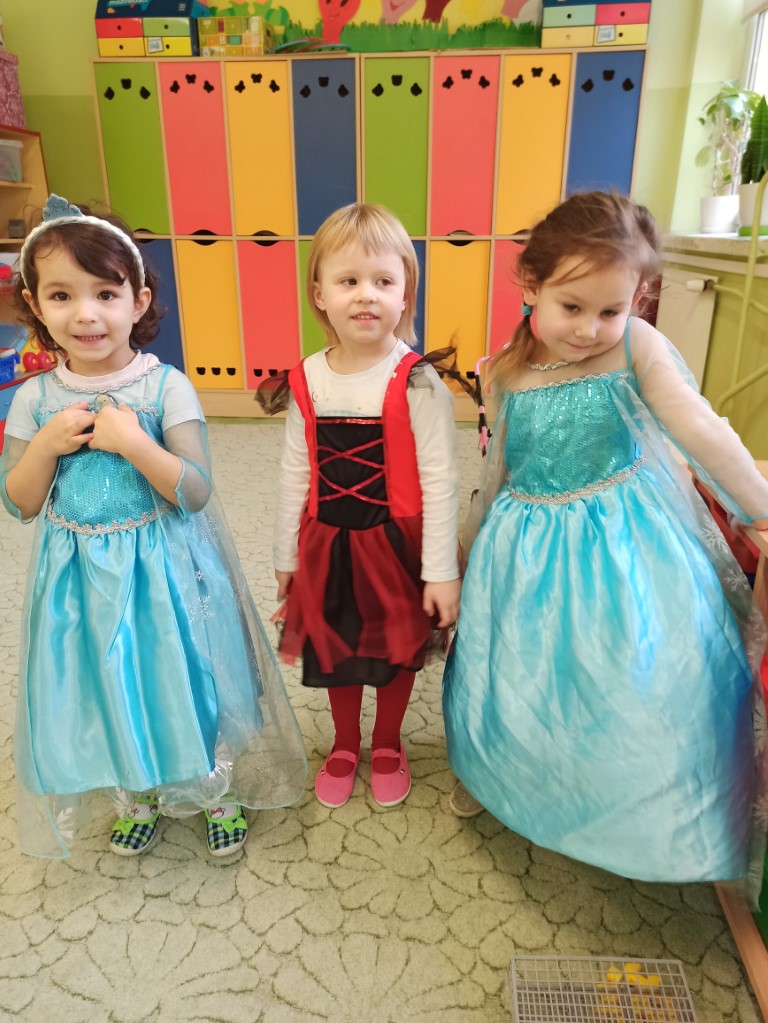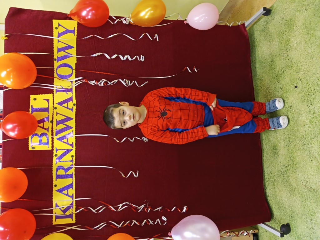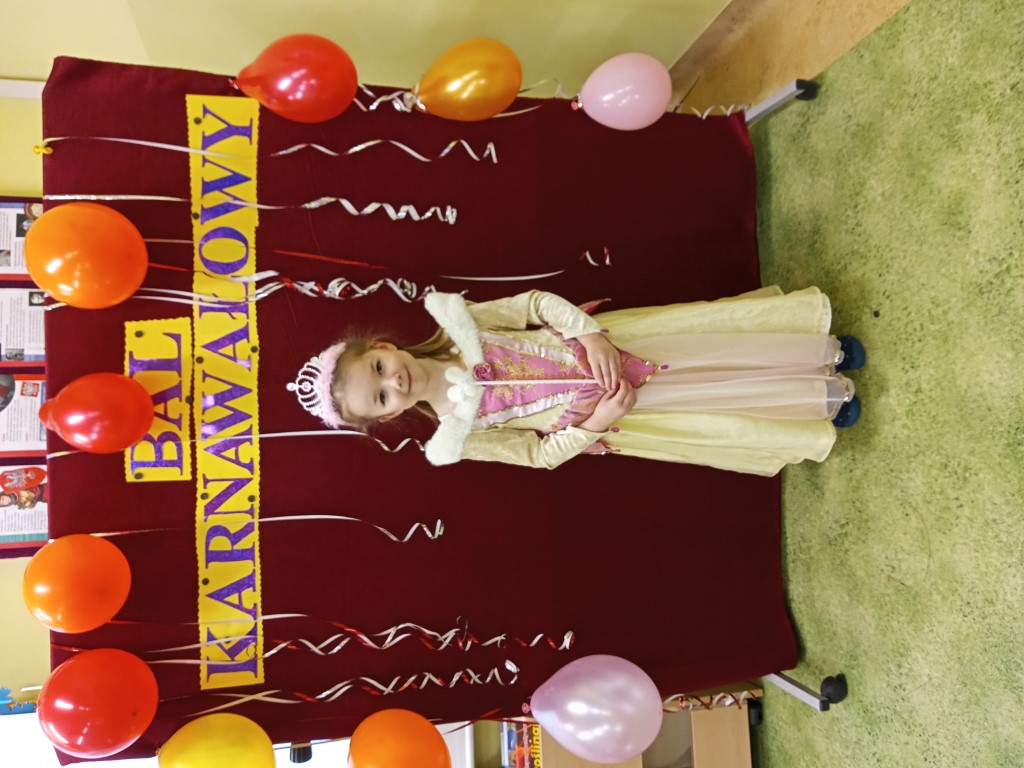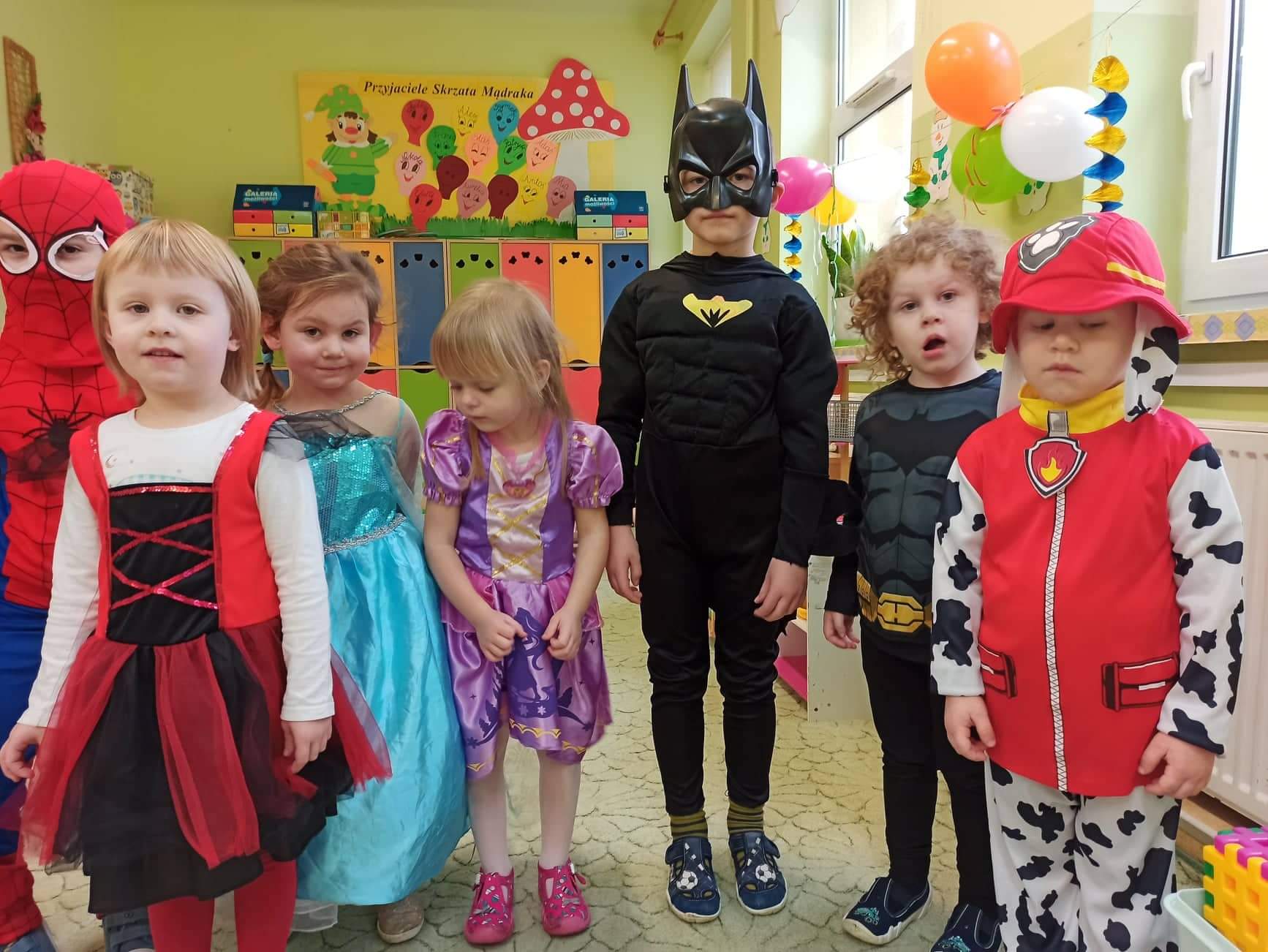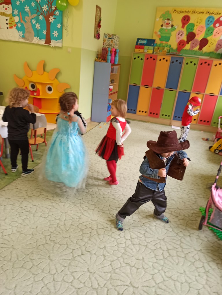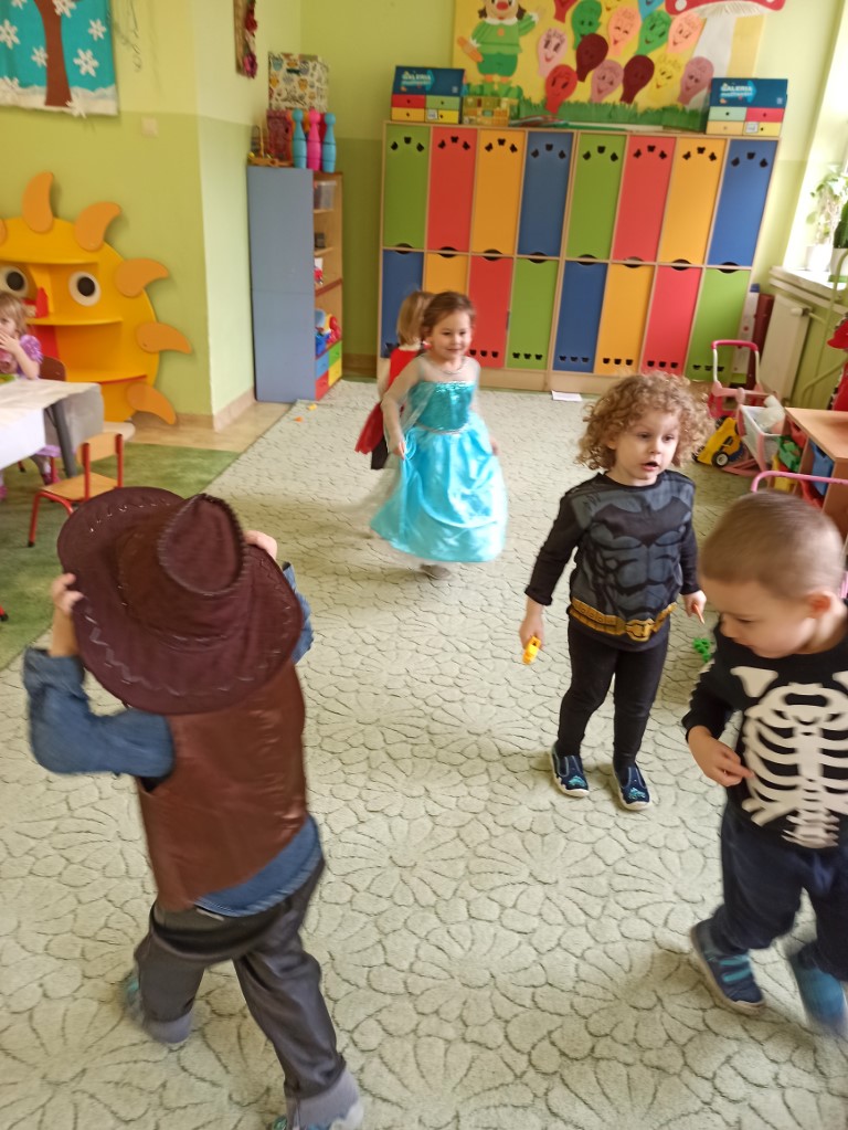 W tym roku zabawa karnawałowa w naszym przedszkolu odbyła się w ostatnim tygodniu przed feriami. Ze względu na panującą pandemię dzieci z grupy "Skrzatów" i "Pszczółek" bawiły się w swoich salach, które pięknie przystroiły w kolorowe balony i serpentyny. Doskonała muzyka i wesoła atmosfera sprzyjały dobrej zabawie. Przedszkolaki ubrane w kolorowe stroje: księżniczek, superbohaterów i innych postaci z ulubionych bajek bawiły się wesoło ze swoimi paniami. Dzieci również chętnie uczestniczyły w przygotowanych zabawach muzyczno - ruchowych.