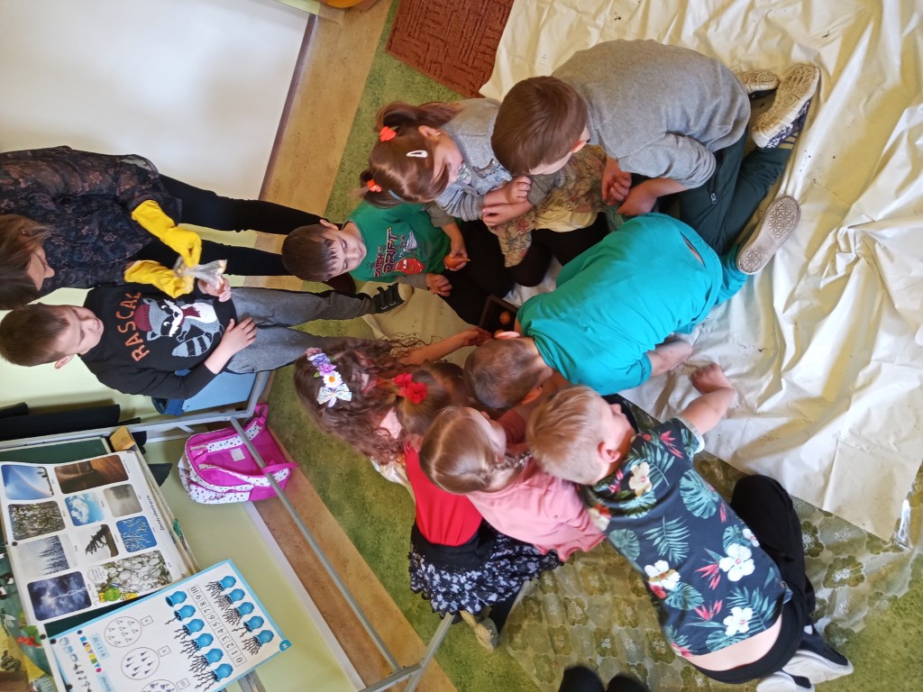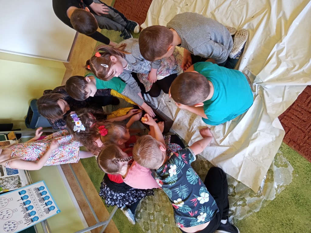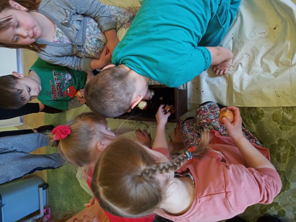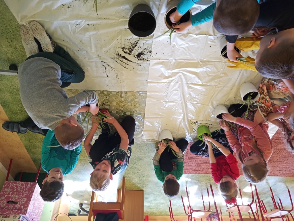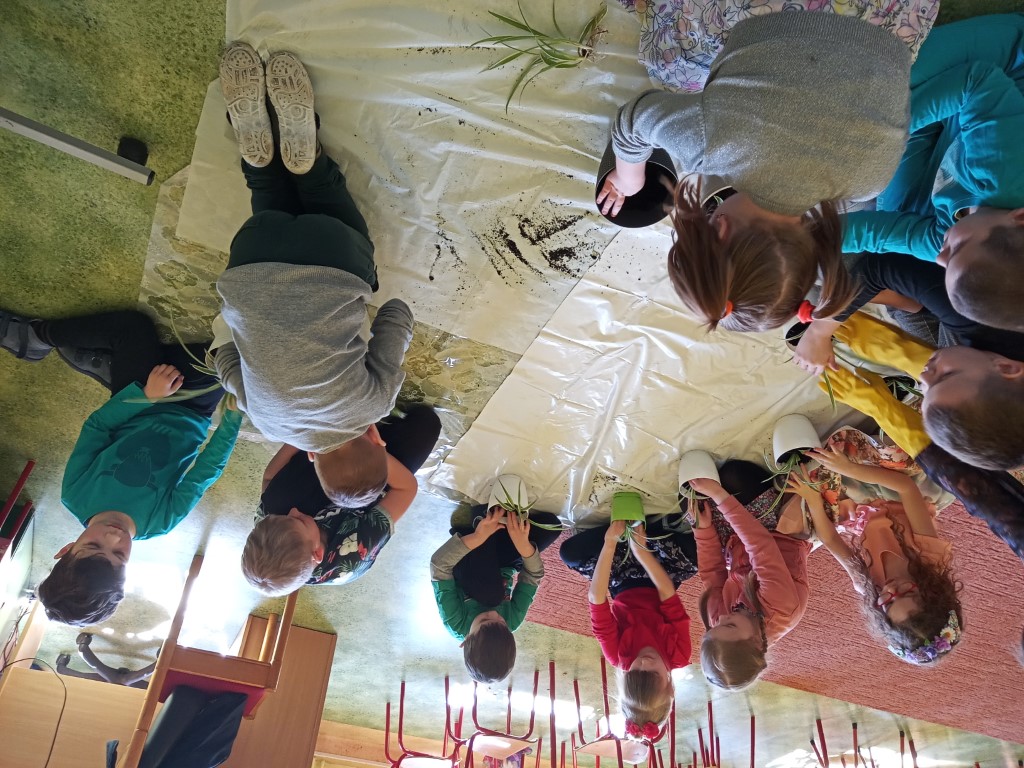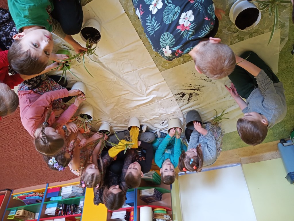 Kącik przyrody jest także ważnym elementem dekoracyjnym i dydaktycznym w przedszkolu. Dzięki stałym zmianom w kąciku dzieci poznają pory roku, potrafią je wyróżnić i scharakteryzować. Dlatego też w pierwszym dniu wiosny dzieci zakładały swój zielony ogródek. Na początku dowiedziały się co potrzebne jest do posadzenia roślin i jak ważna jest woda i słońce do wzrostu roślin. Następnym etapem było przygotowanie ziemi w doniczkach. Dzieci posadziły cebulę na pyszny szczypiorek, Nie zapomniały również o roślinach ozdobnych – trawkach dekoracyjnych. Następnie wszystkie przedszkolaki udały się na wiosenny spacer, aby poszukać oznak wiosny w przyrodzie. Kolejnym punktem była praca plastyczna, maluchy ozdabiały suknię Pani Wiosny kwiatami, starszaki malowały Wiosnę farbami.