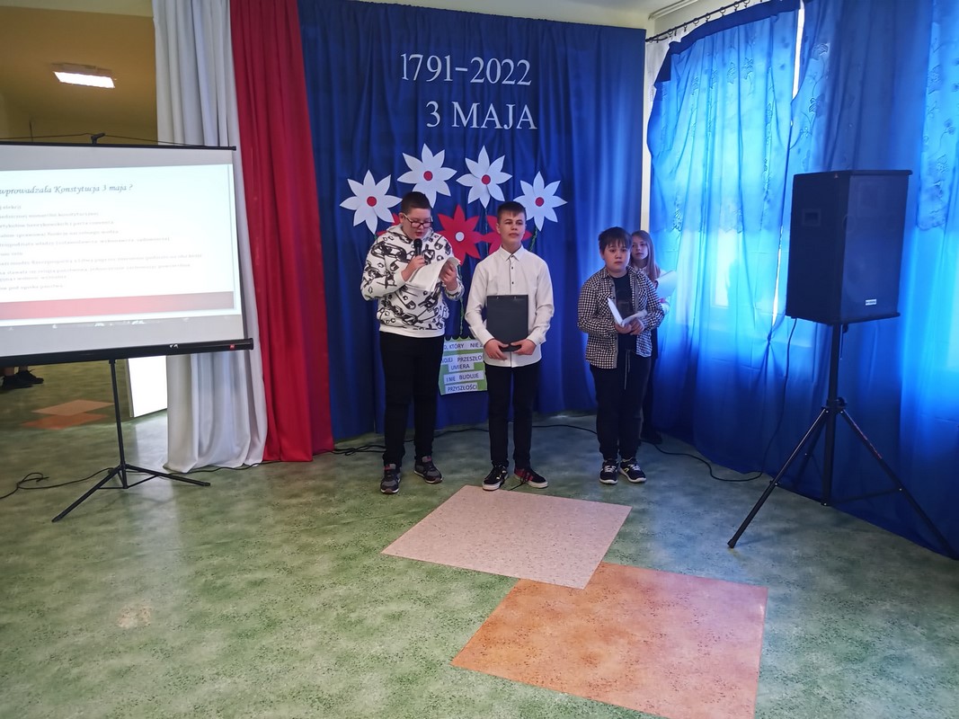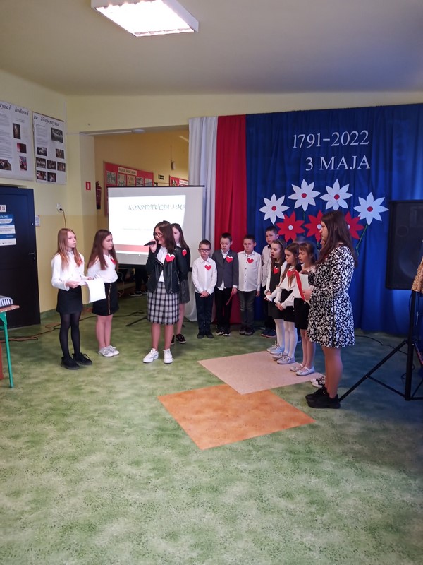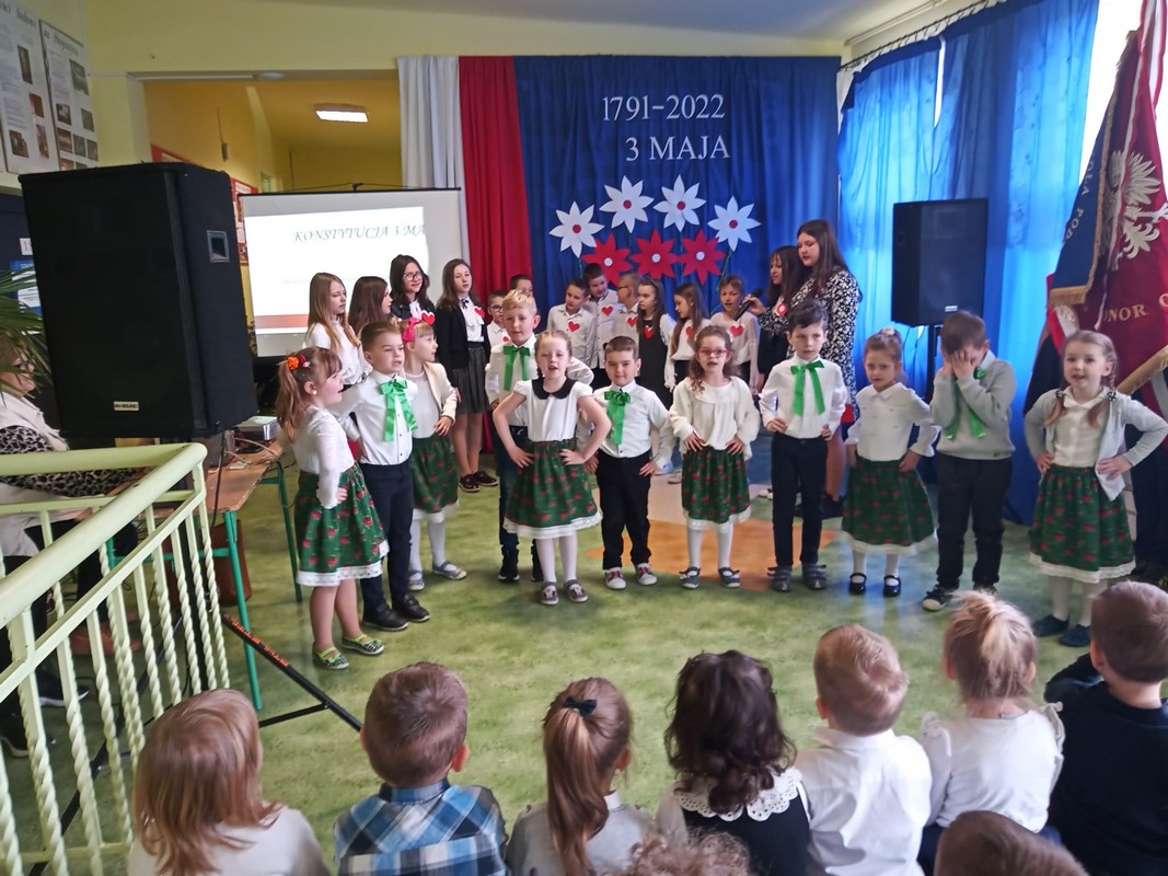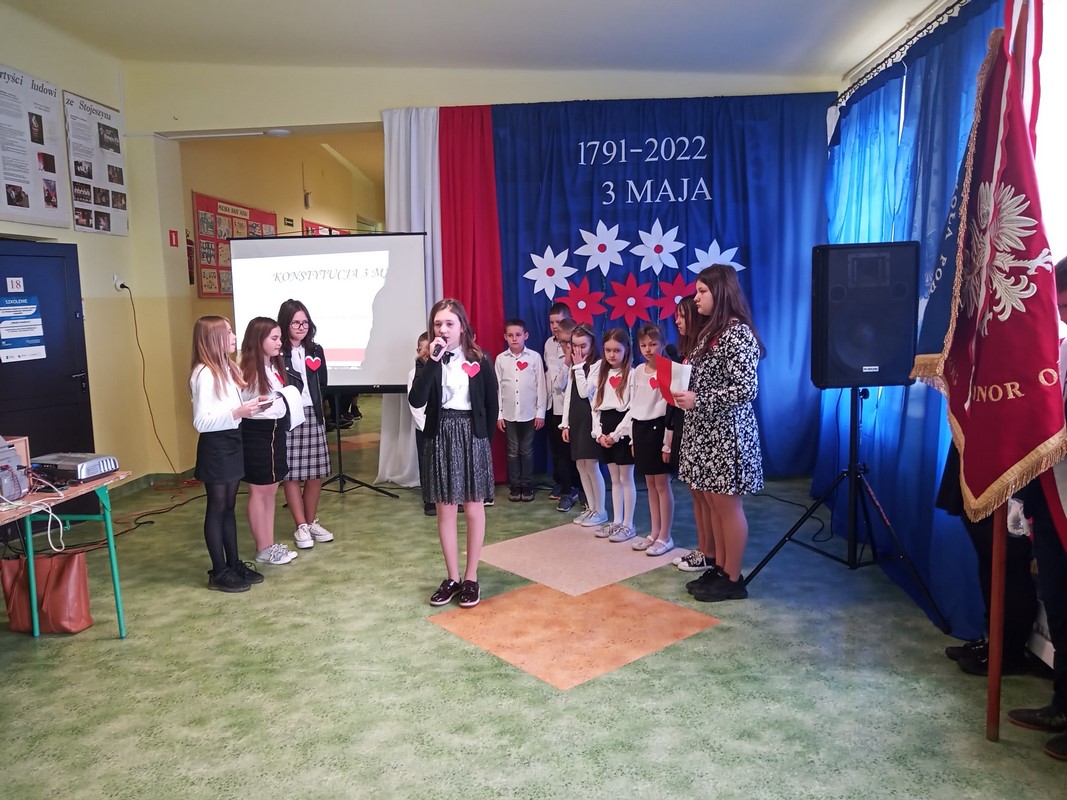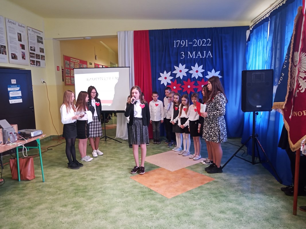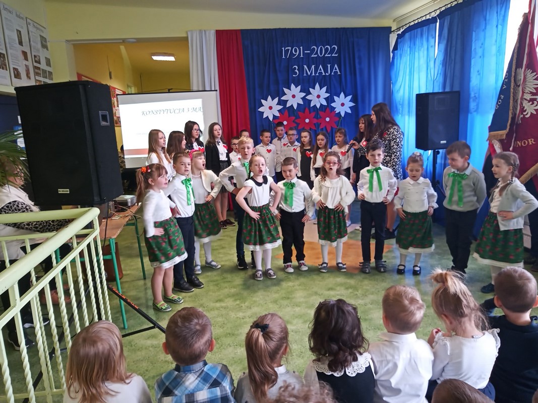 Inscenizację słowno - muzyczną z tej okazji zaprezentowali wspólnie uczniowie klasy II, IV i V. Nawiązywała ona do przeszłości, historii oraz okoliczności uchwalenia pierwszej w Europie, a drugiej na świecie konstytucji.