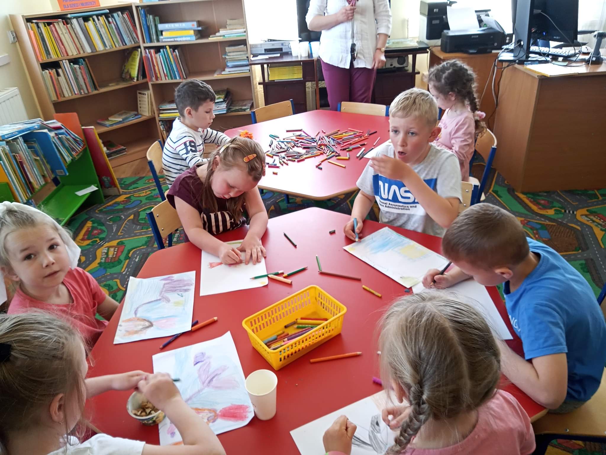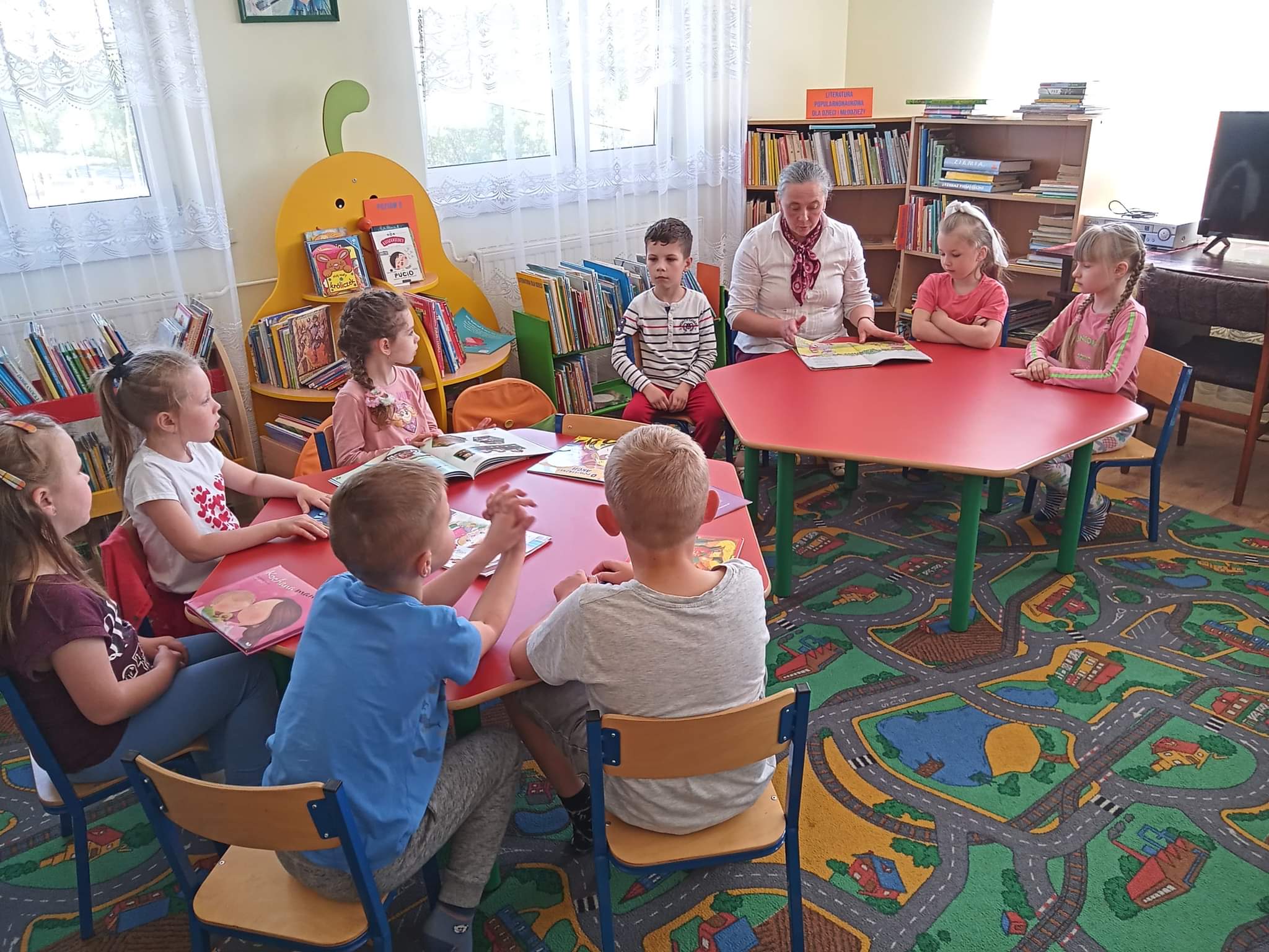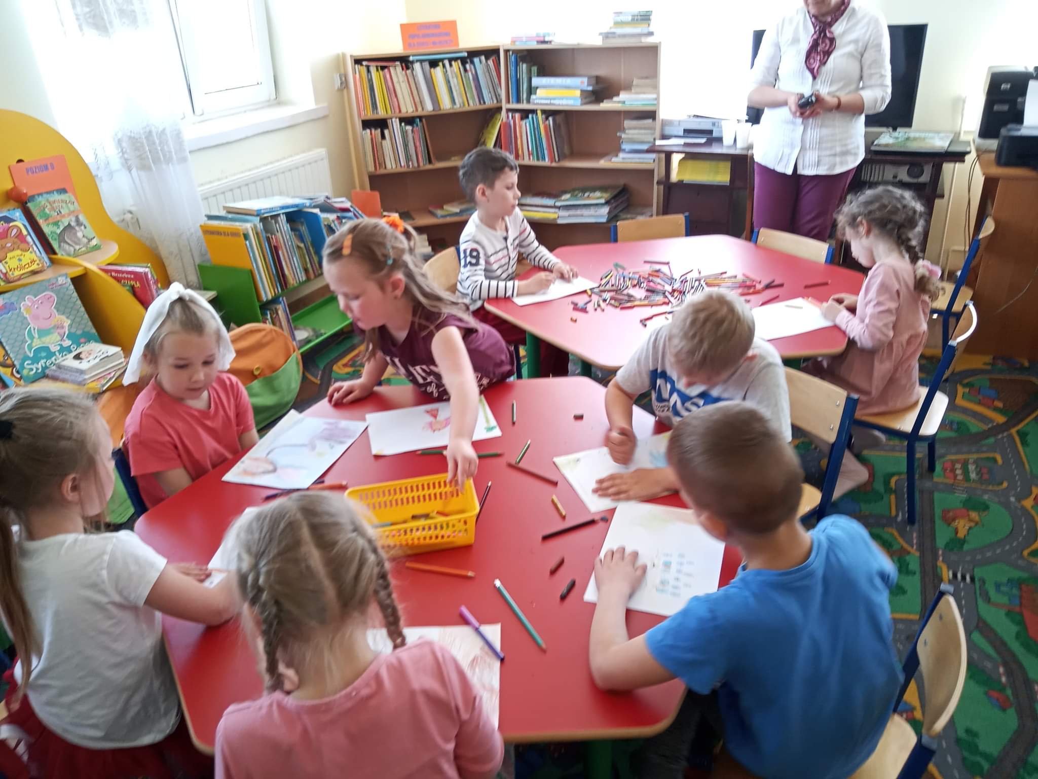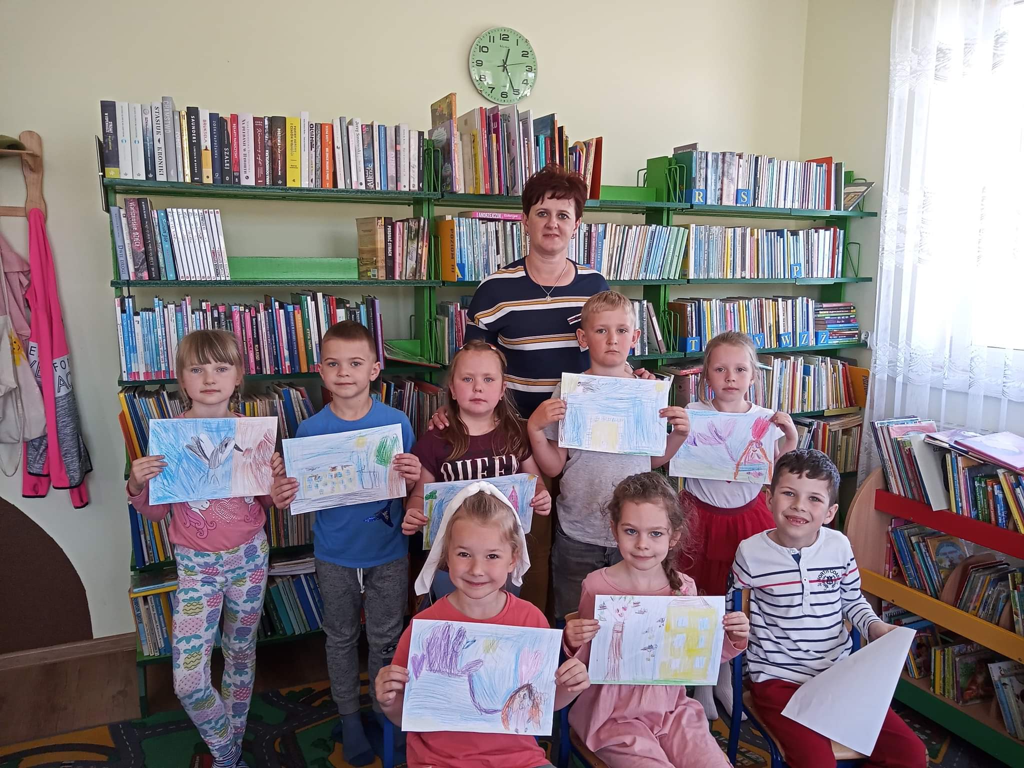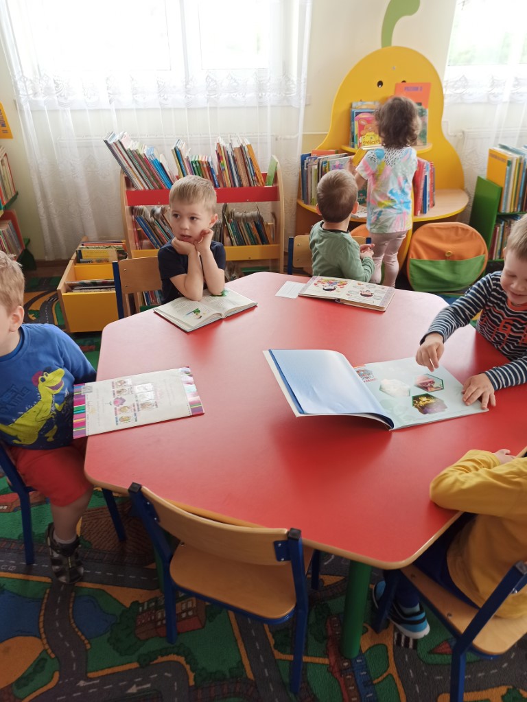Dzieci  dowiedziały się również, jak zachować się w bibliotece, mogły przeglądać inne książki znajdujące się na półkach, poznać pracę Pani bibliotekarki oraz wykonać prace plastyczne, które zawisły na wystawie w bibliotece.