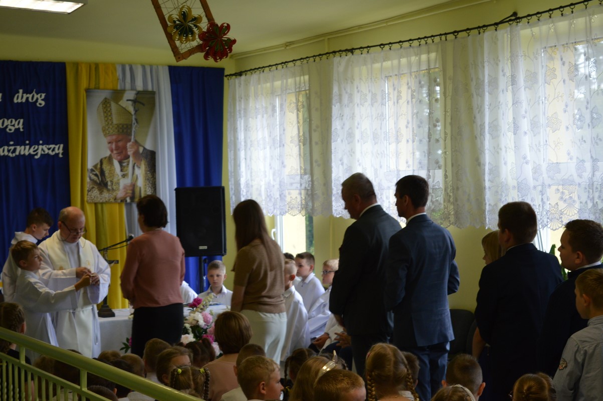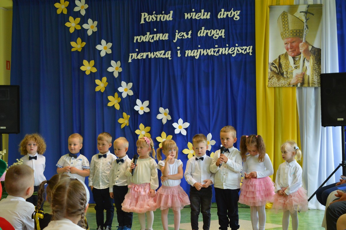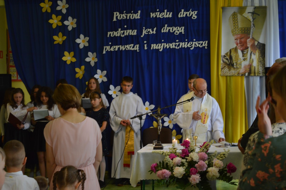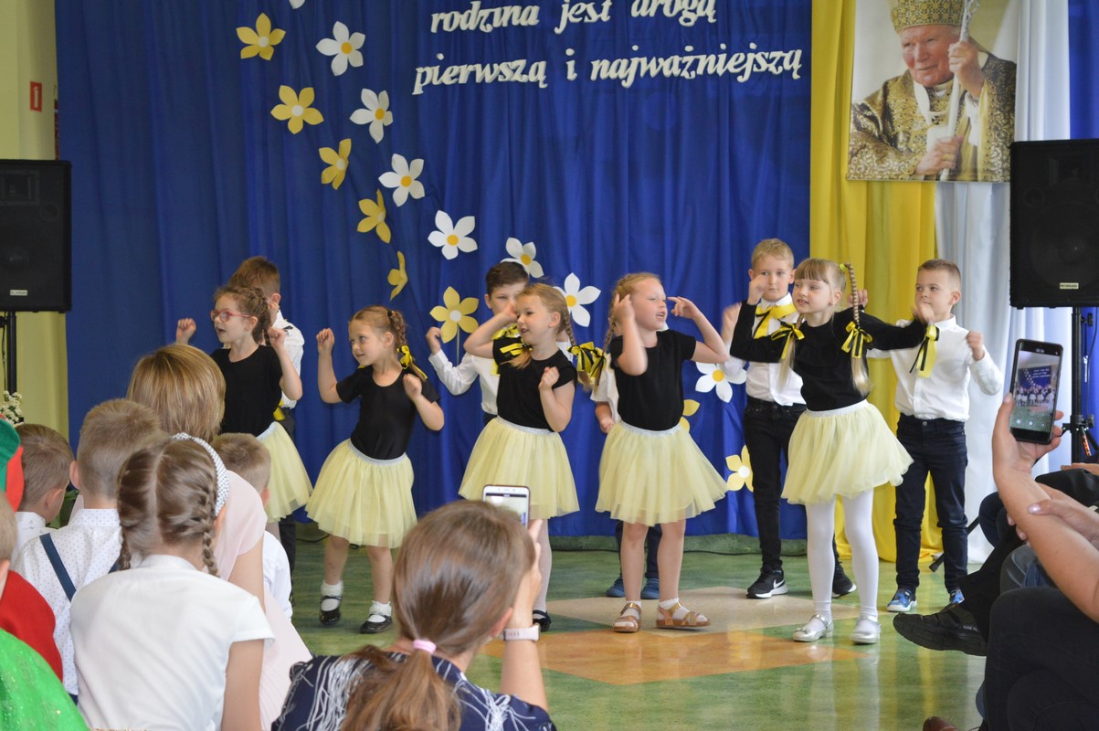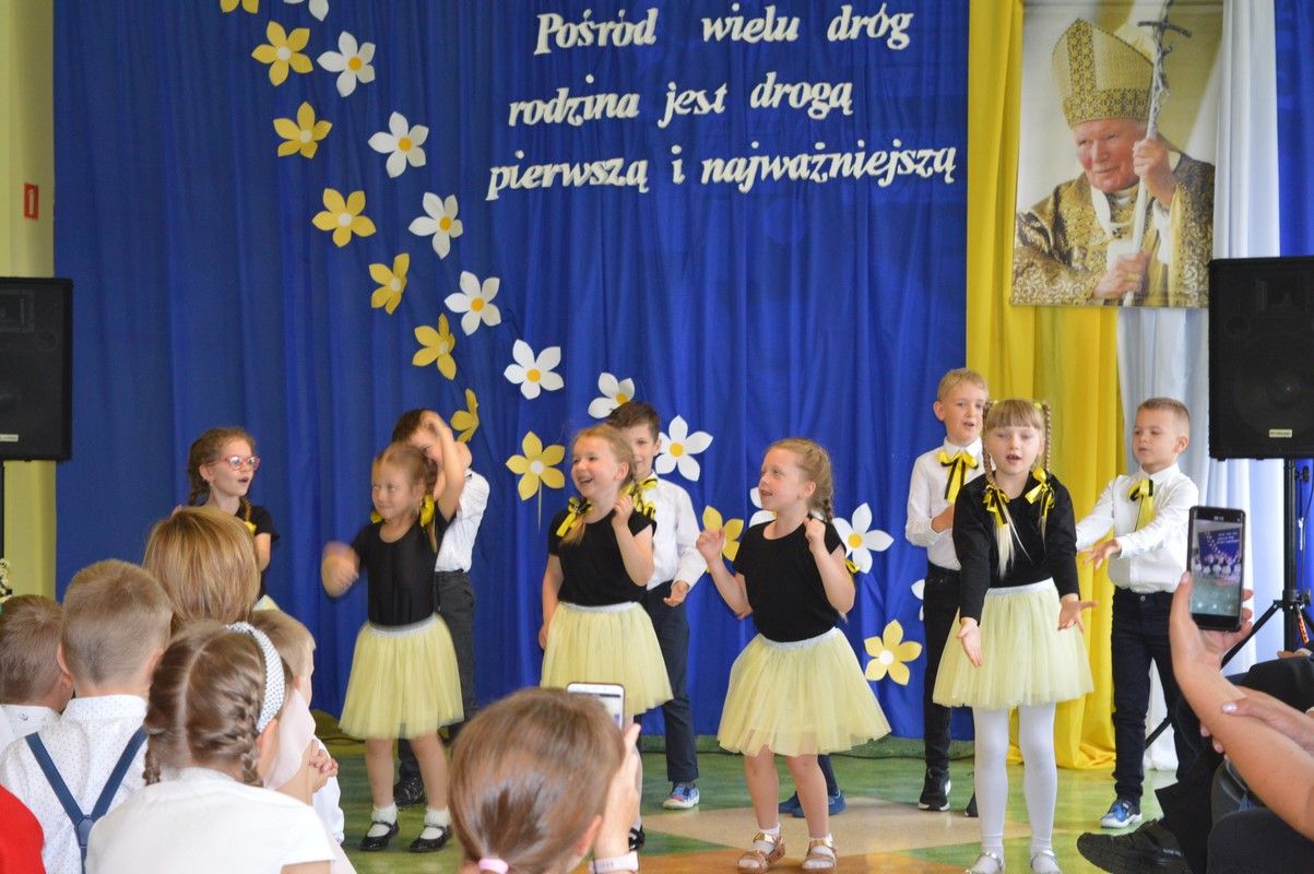 Uroczystą część święta szkoły rozpoczęły występy dzieci z przedszkola, zerówki oraz kl. I – III, które występem, piosenką, tańcem i wierszem podziękowały swoim rodzicom, babciom i dziadkom za miłość, trud i oddanie. Następie miała miejsce uroczysta akademia przygotowana przez uczniów kl. IV – VIII, młodzież przypomniała najważniejsze wydarzenia z życia Papieża Polaka, wplatając w te wspomnienia piękne piosenki i nagrania słów św. Jana Pawła II. Na zakończenie uczniowie najstarszych klas zatańczyli Poloneza.