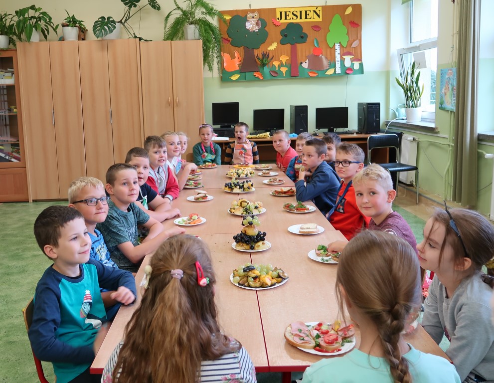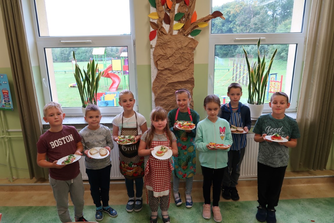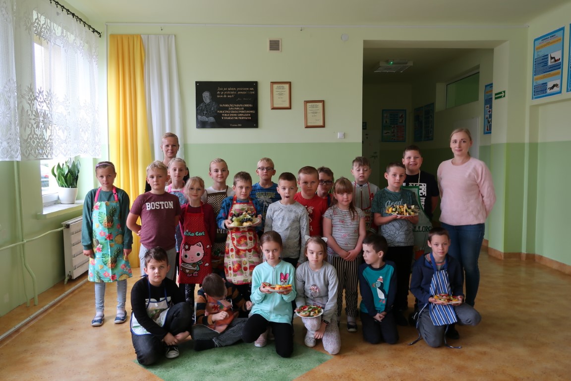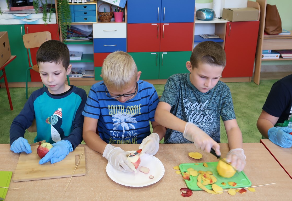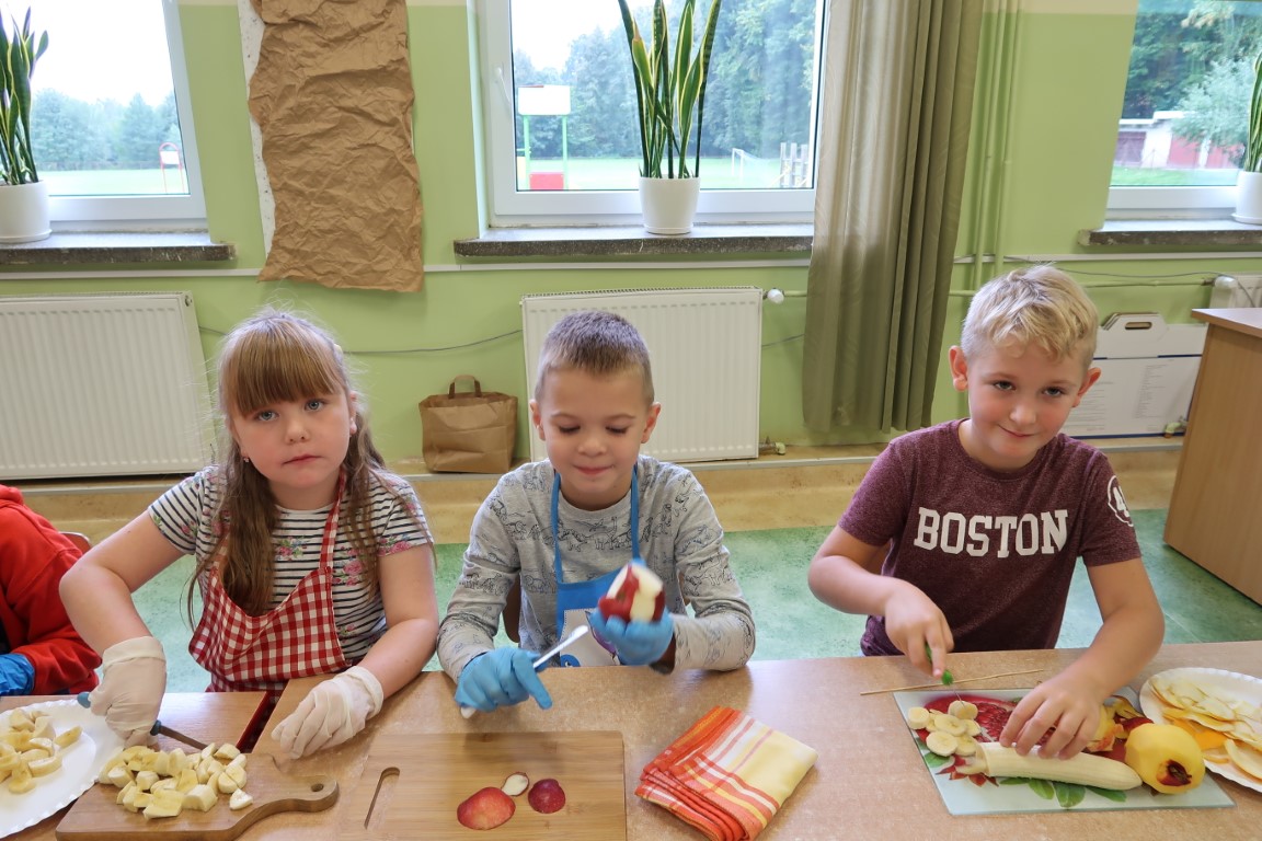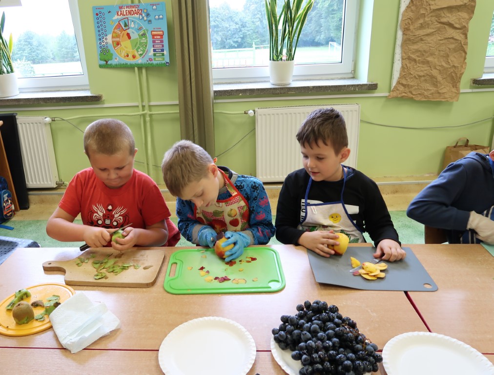 Dzieci tego dnia miały dużo pracy, każdy kroił owoce na kawałki oraz nadziewał na patyczki tworząc pyszne i zdrowe szaszłyki owocowe. Dzieci wykonywały również jeżyki z gruszek i winogron oraz kanapki. Wszyscy pracowali z ogromnym zaangażowaniem i świetnie sobie poradzili. Po skończonej pracy wszystkie dzieci ze smakiem zjadły zdrowe przysmaki. Warsztaty sprawiły uczniom wiele radości i satysfakcji.