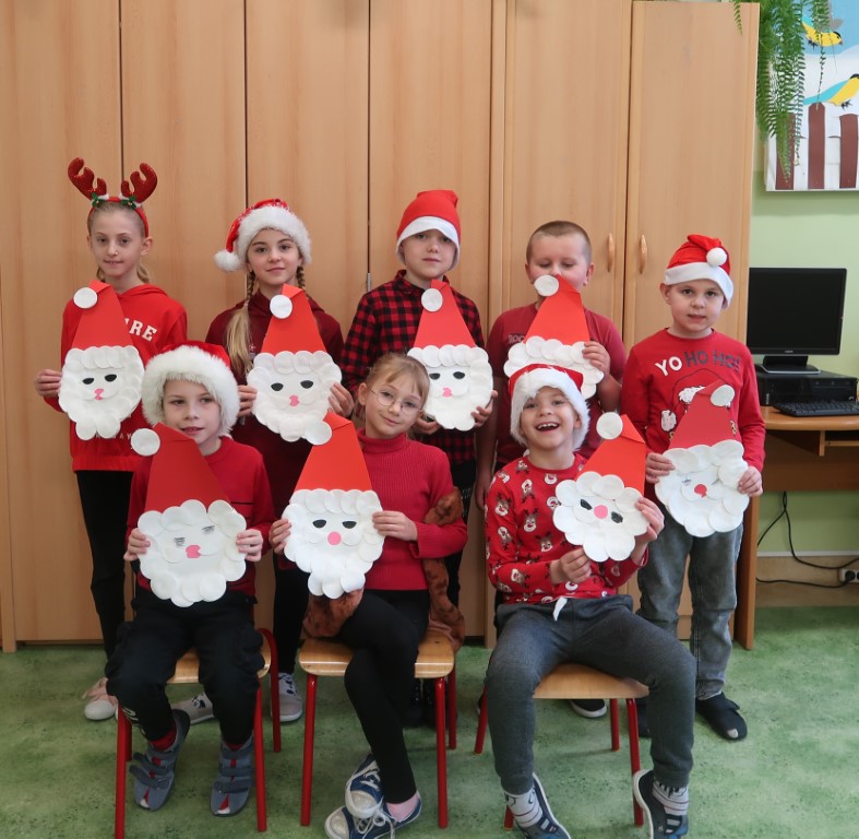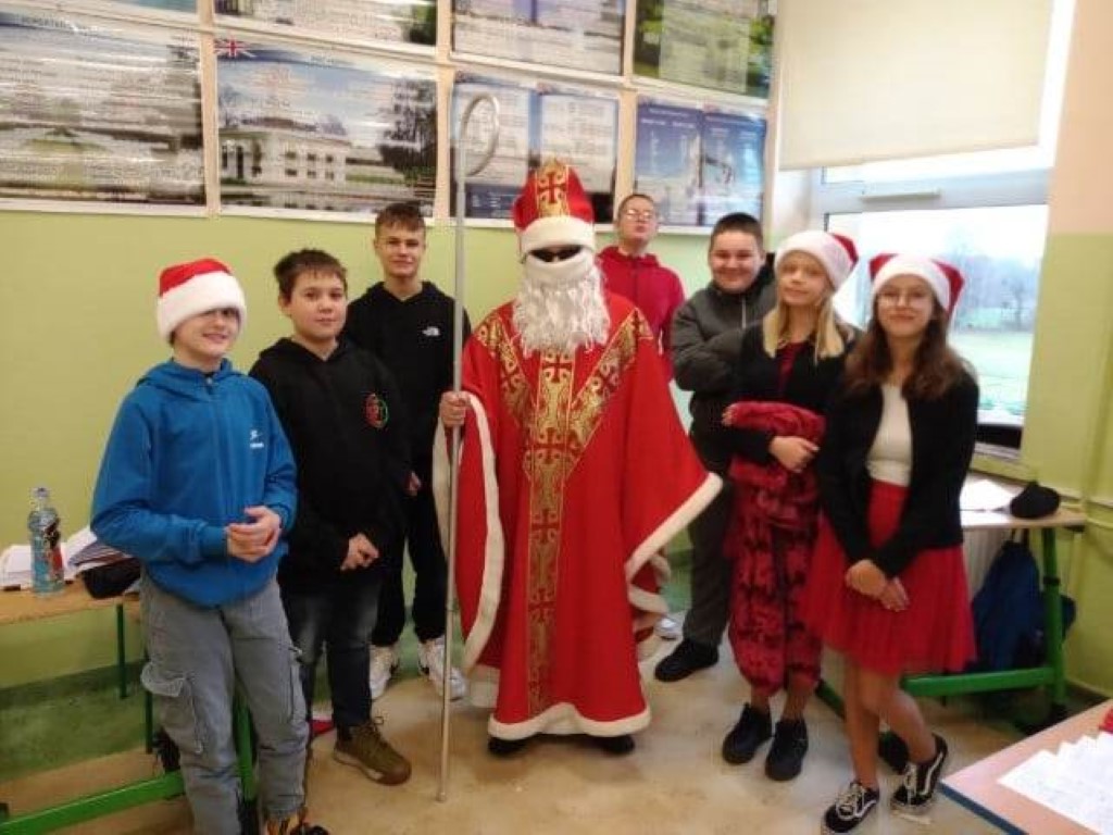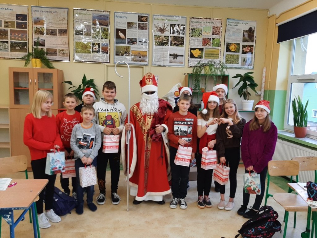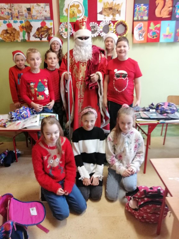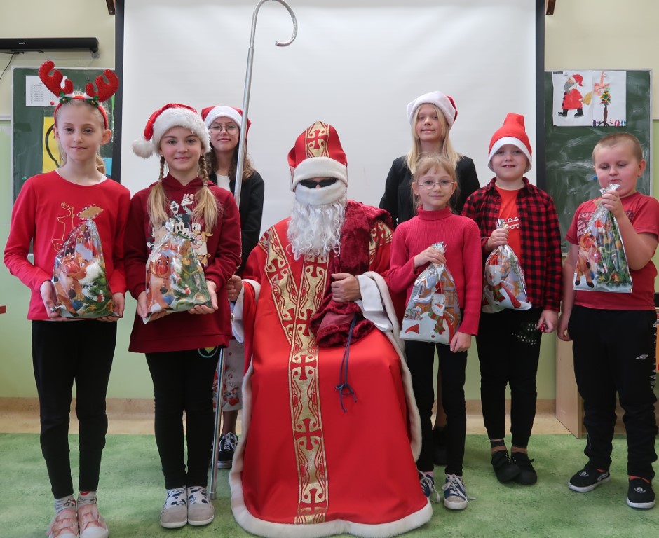 6 grudnia pojawił się w naszej szkole długo oczekiwany przez wszystkie dzieci gość – Święty Mikołaj w asyście dwóch śnieżynek. Uczniowie starannie przygotowywali się do tego szczególnego dnia. Uczyli się wierszyków i piosenek oraz wykonywali prace plastyczne przedstawiające Mikołaja.