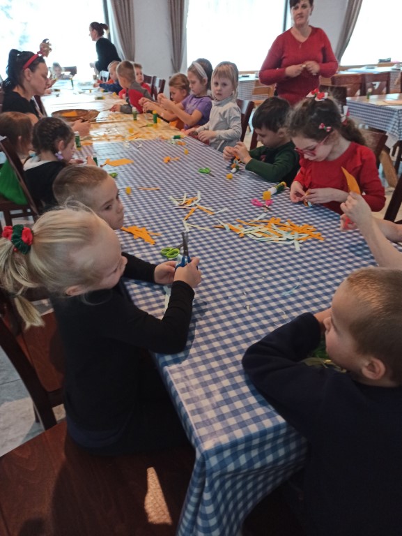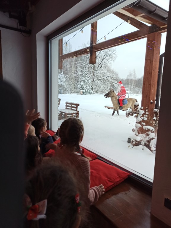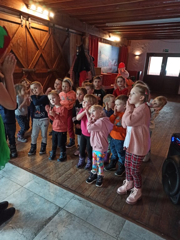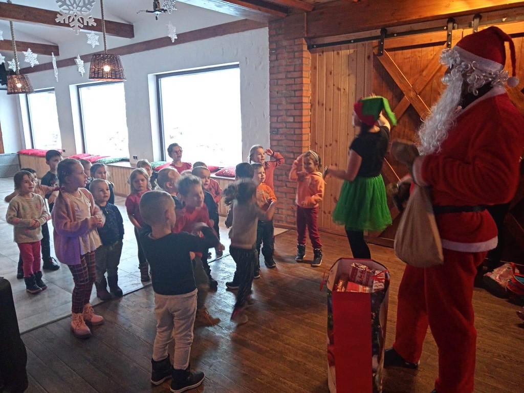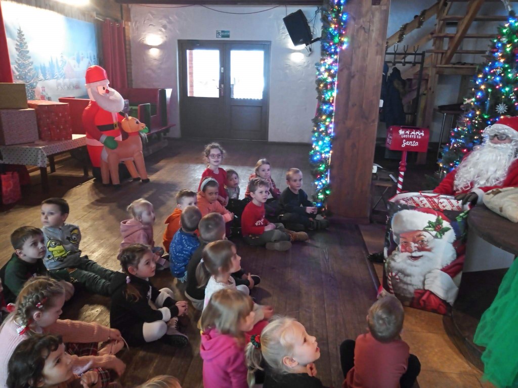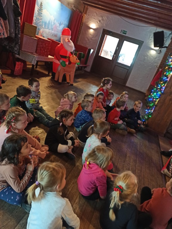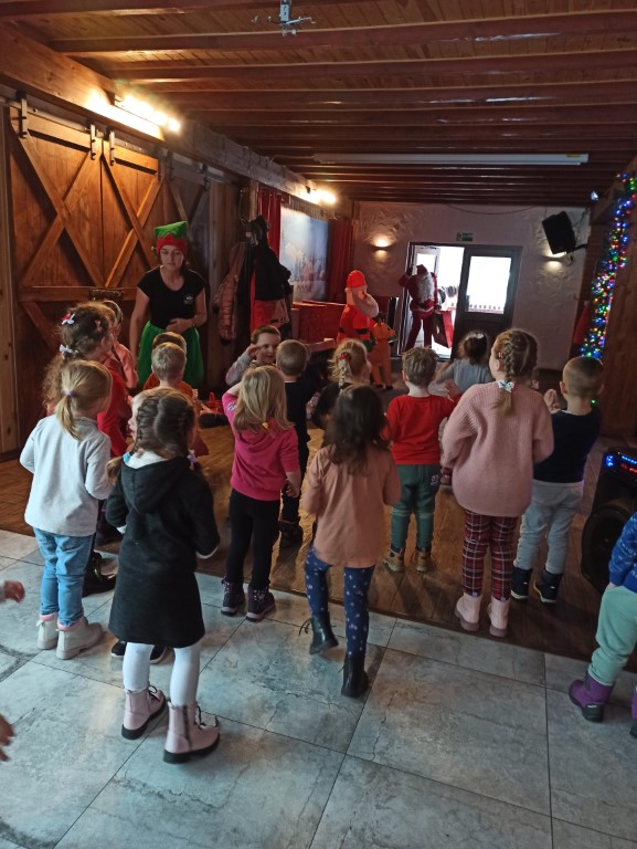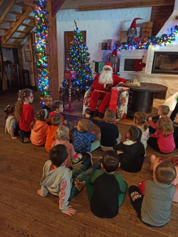 Na warsztatach dzieci mogły spędzić aktywnie czas biorąc udział w grach zespołowych, zabawach ruchowych oraz w zajęciach plastycznych, na których przygotowały łańcuch z papieru i kolorową bombkę. Miłą niespodzianką była wizyta Świętego Mikołaja. Przyjechał do dzieci na koniu z prezentami dla naszego przedszkola. W Osadzie mieszkają również zwierzęta, które dzieci mogły zobaczyć i nakarmić smakołykami.