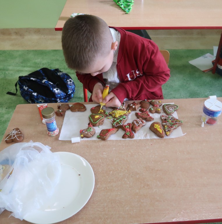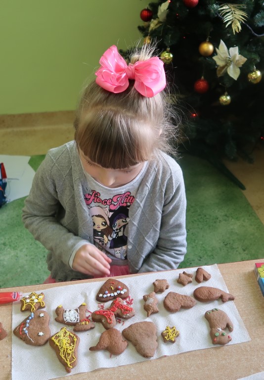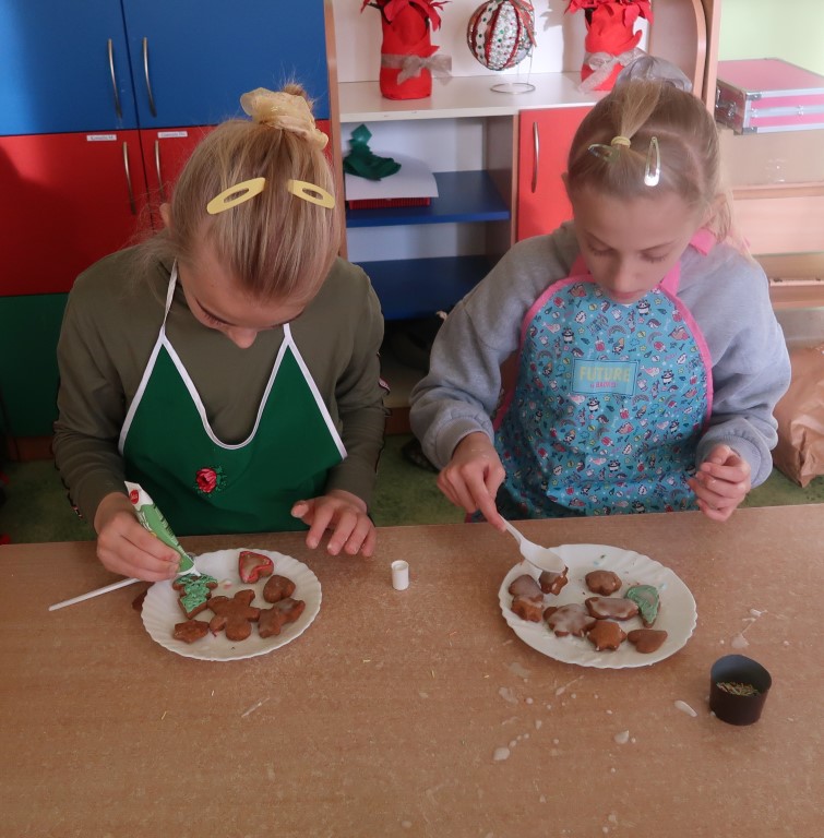19 grudnia zgodnie z przedświąteczną tradycją uczniowie z klas I-III wraz z wychowawcami, upiekli pyszne pierniczki. Uczniowie mieszali składniki, wygniatali i wałkowali ciasto według przygotowanego wcześniej przepisu. Wszystkim podobało się wykrawanie świątecznych kształtów – choinek, gwiazdek, serduszek, przy pomocy foremek. Podczas pieczenia pierników w całej szkole unosił się wspaniały zapach, który wprawił wszystkich w świąteczny nastrój. Największą radość dzieciom sprawiło ozdabianie pierników za pomocą kolorowych pisaków i barwnych posypek. Zabawa była doskonała, a pierniczki wyszły przepięknie.