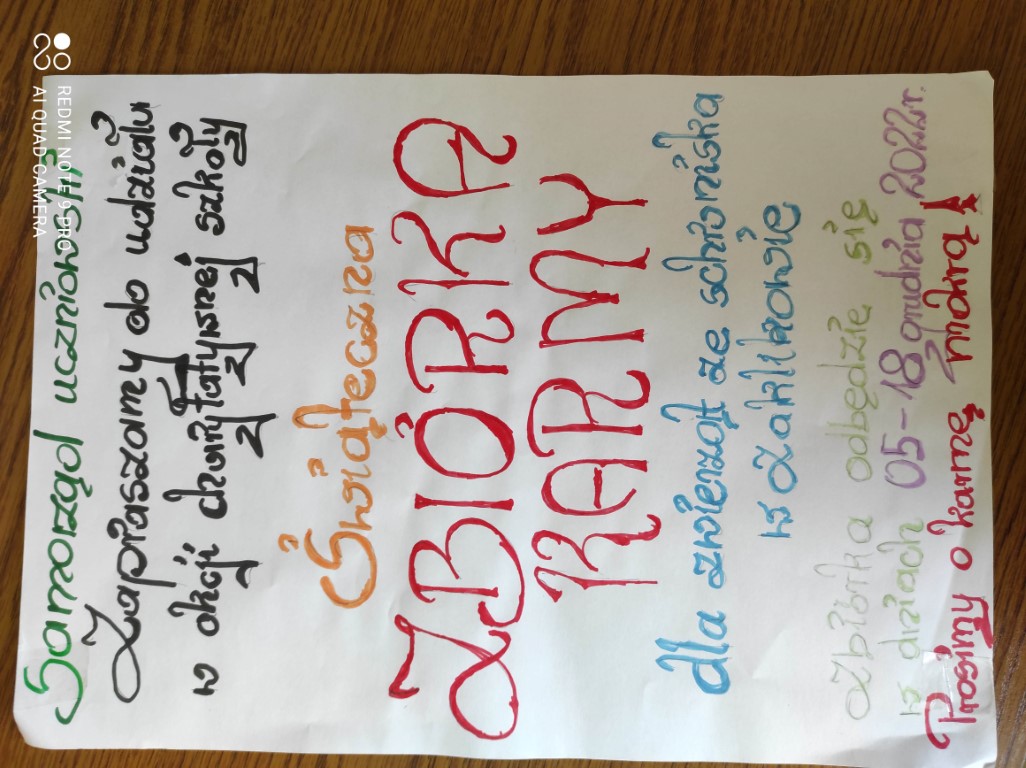 W dniach 8 – 18 grudnia samorząd szkolny prowadził w naszej szkole akcję zbiórki karmy dla podopiecznych przytuliska dla zwierząt w Zaklikowie. Akcja ta cieszyła się dużym zainteresowaniem zarówno ze strony uczniów jak i nauczycieli. Wszystkim zaangażowanym, którym los samotnych zwierzaków nie jest obojętny serdecznie dziękujemy.