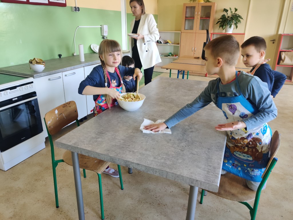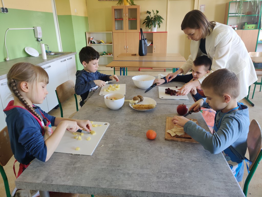 Uczniowie klasy 1 „wybrały się w podróż po zdrowie” i wykonały wyśmienitą oraz zdrową sałatkę owocową. Przed przystąpieniem do pracy wzajemnie pomagały sobie przy zakładaniu i wiązaniu fartuszków. Następnie po zapoznaniu się z zasadami bezpiecznego posługiwania się nożem i po dokładnym umyciu rąk, nasi mali kucharze zabrali się do krojenia owoców. Najważniejszym punktem tego dnia była degustacja. Zapach owoców roznosił się po całej klasie.