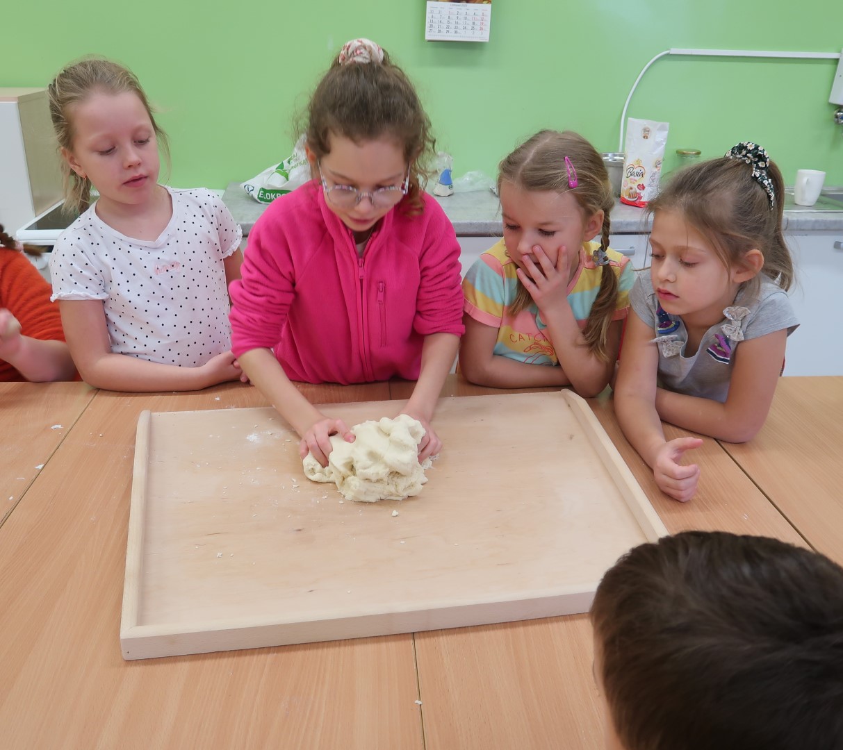 Lepienie z masy solnej sprawiło dzieciom wiele radości. Zabawa ciastem solnym wpływa na doskonalenie sprawności rąk, pobudza wyobraźnię, kształtuje twórcze myślenie i wrażliwość zmysłową. Na zajęciach wykorzystano wyposażenie sali kulinarnej w ramach projektu ,,Laboratoria Przyszłości”.