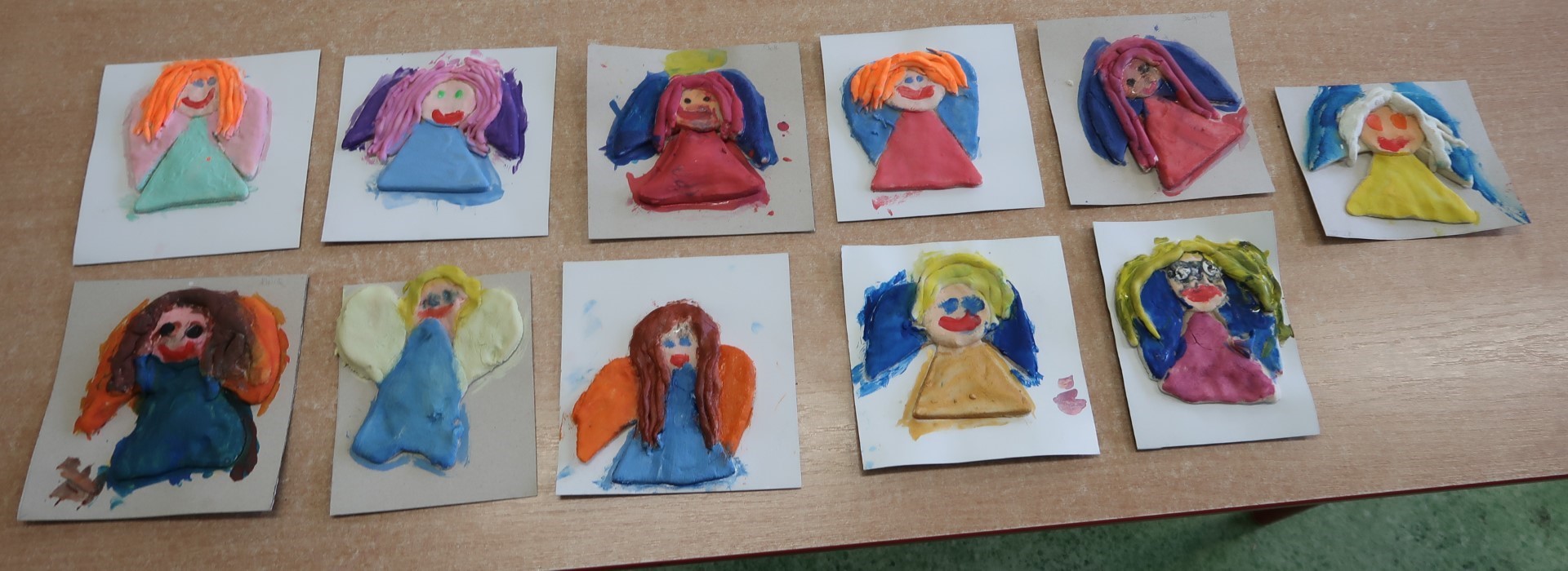 Uczniowie najpierw bacznie obserwowali, jak robi się masę solną, co pewien czas sprawdzając jej konsystencję. Kiedy masa solna była już gotowa dzieci z zapałem wzięły się do pracy. Każde dziecko samodzielnie ulepiło aniołka z masy solnej, którego po całkowitym wyschnięciu pięknie pomalowało farbą plakatową.
